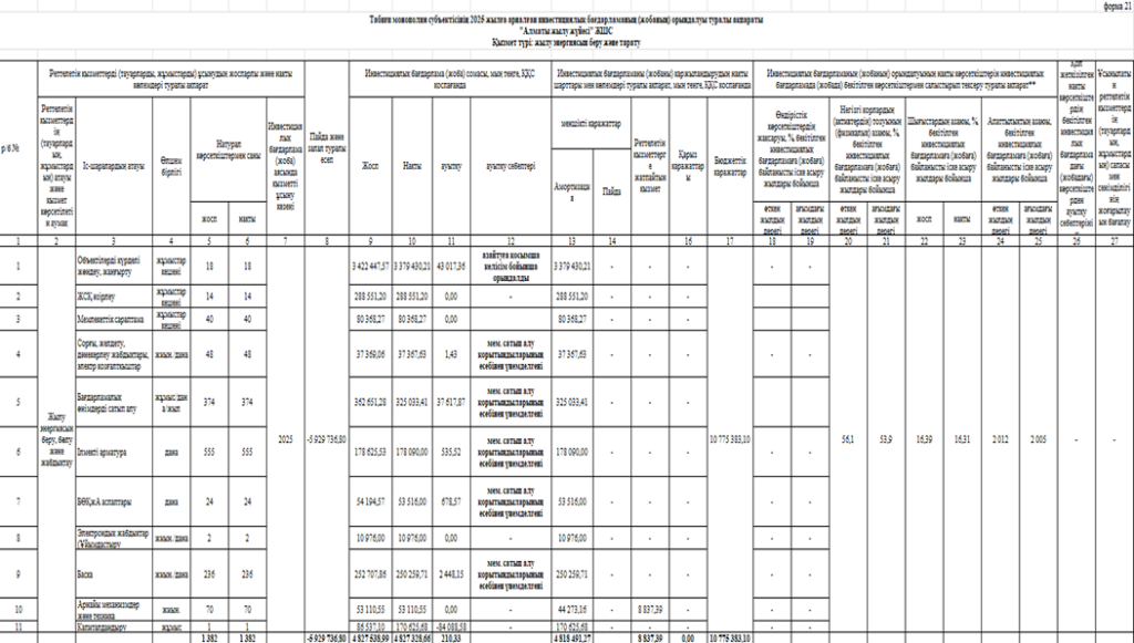 ТҚҚ-ның 6 тарауының 338 тармағына сәйкес бекітілген инвестициялық бағдарламаны іске асыру «АлЖЖ» ЖШС тарифіне енгізілген пайда мен амортизациялық аударымдар есебінен жүзеге асырылуы тиіс. 2025 жылдың ішінде «АлЖЖ» ЖШС нақты амортизациясы бекітілген мөлшері 4 691,2 млн. тг. бола тұра, 6 327,3 млн. тг. құрайтынын айта кету керек.